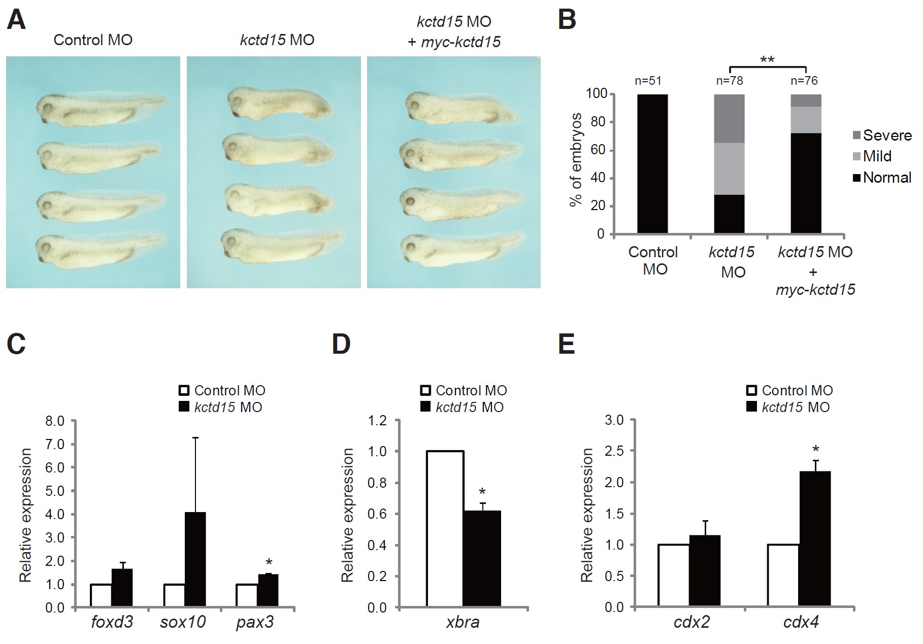 Fig. 5. Essential role of Xenopus kctd15 in ventral development. (A) Control MO (80 ng) or kctd15 MO (80 ng) was injected into the animal pole of each ventral blastomere at the four-cell stage. For rescue experiments, myc-kctd15 mRNA (700 pg) was coinjected with kctd15 MO (80 ng). At the late tailbud stage, injected embryos were photographed with anterior to the left and dorsal to the top. (B) Obtained phenotypes were classified into three groups (severe, mild or normal) according to the extent of defects in ventral and caudal morphologies. **, P < 0.01. Fisher exact test was used to compare the frequency of normal development between embryos injected with kctd15 MO alone and those injected with kctd15 MO plus myc-kctd15 mRNA. P = 2.7 x 10-5. (C-E) Real-time quantitative RT-PCR analysis of marker gene expression. Embryos ventrally injected with control MO (80 ng) or kctd15 MO (80 ng) were cultured until stage 15 (C), 19 (D) or 24 (E). The relative expression levels of the indicated genes were normalized to that of odc. Shown is the average of two independent experiments. The error bar represents SD. *P < 0.05, **P < 0.01, unpaired t test. P values versus control were as follows: 0.085 for foxd3 expression, 0.30 for sox10 expression, 0.00065 for pax3 expression, 0.0089 for xbra expression, and 0.48 for cdx2 expression, and 0.011 for cdx4 expression. |