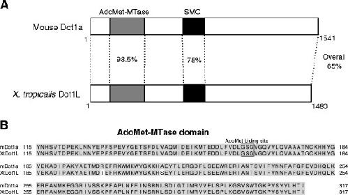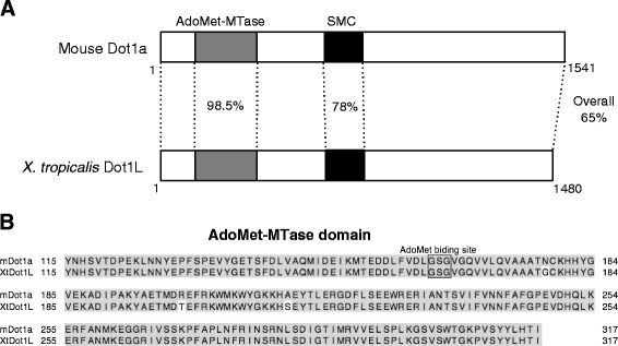 Figure 1. Mouse and Xenopus tropicalis DOT1L proteins are highly conserved. (A) Schematic alignment of mouse and Xenopus tropicalis DOT1L. The gray boxes represent conserved domains for S-adenosylmethionine (AdoMet or SAM)-dependent methyltransferases (AdoMet-MTases). The black boxes indicate structural maintenance of chromosome (SMC) domains. GenBank accession numbers: Mouse (m; Mus musculus) Dot1a (AAP42293) [50], Xenopus tropicalis (Xt) Dot1L (XP_002937984). Note that the N-terminal region is highly conserved between mouse and Xenopus tropicalis Dot1L due to the presence of the AdoMet-MTase and SMC domains. (B) The amino acid sequences of the nearly perfectly conserved AdoMet-MTase domain of mouse and Xenopus DOT1L. The AdoMet-binding site, which is essential for the methyltransferase activity, is boxed.