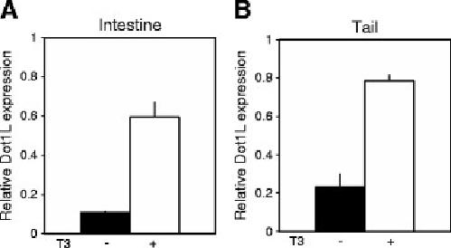 Figure 2. Xenopus tropicalis Dot1L is induced in the intestine and tail upon treatment of premetamorphic tadpoles with T3. Stage 54 tadpoles were treated with 10 nM T3 for 2 days and total RNA was isolated from the intestine (A) and tail (B). qRT-PCR was conducted to examine the expression of Dot1L mRNA. Dot1L expression was normalized to the expression of the control gene EF1α (elongation factor 1α). Error bars indicate s.e.m.
