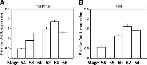 Figure 3. Upregulation of Xenopus tropicalis Dot1L expression in the intestine and tail during natural metamorphosis. Total RNA was isolated from the intestine (A) and tail (B) at the indicated developmental stages from premetamorphosis to the end of metamorphosis (stage 66). The expression of Dot1L mRNA was determined by qRT-PCR as in Figure 2. Error bars indicate s.e.m. Note that there were no tail samples at stage 66 (B) as the tail is completely resorbed by stage 66.