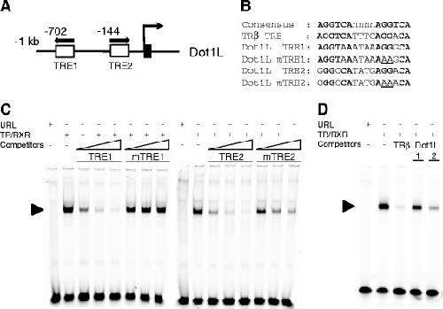 Figure 4. TR binds to the putative TREs in Dot1L gene in vitro. (A) Schematics diagram of the putative TREs in Xenopus tropicalis Dot1L gene. The TREs are shown as white boxes with arrows indicating the orientation of TREs. The black box shows exon. (B) The sequences of wild type and mutant Dot1L TRE1 and TRE2 used in the gel shift assay in comparison to the consensus TRE and the TRE of Xenopus laevis TRβA gene. Bold letters show conserved nucleotides and the mutated nucleotides are underlined. (C) Both Dot1L TRE1 and TRE2 compete against the TRE of Xenopus laevis TRβA for binding to TR/RXR heterodimers. The labeled Xenopus laevis TRβA promoter TRE was mixed with in vitro translated TR/RXR heterodimers in the presence or absence of 4×, 20×, or 100× unlabeled wild type or mutant Dot1L TRE1 or TRE2 as indicated. The reaction mixture was analyzed by gel retardation assay. Arrowhead indicates the TR/RXR-TRE complex. Note that both wild-type Dot1L TREs competed while the mutations reduced or abolished their ability to compete for binding to TR/RXR. (D) Dot1L TRE2 has higher affinity than TRE1 for TR/RXR heterodimer in vitro. Gel mobility shift assay was done as in (C) except with 20× unlabeled Xenopus laevis TRβA TRE, Dot1L TRE1, and Dot1L TRE2. Note that Xenopus laevis TRβA TRE competed most effectively, followed by Dot1L TRE2, while Dot1L TRE1 was least effective.