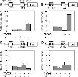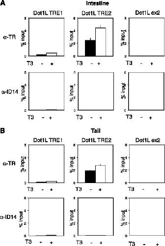 Figure 6. TR binds to the TRE2 in Dot1L promoter in the intestine and tail during T3-induced metamorphosis. Stage 54 tadpoles were treated with or without T3 for 2 days. The intestine (A) or tail (B) was isolated for ChIP assay with a polyclonal antibody against TR (top) or Id14 (bottom), a negative control for antibody specificity. The immunoprecipitated DNA was analyzed by qPCR for the presence of the TRE regions of Dot1L promoter. A region of exon 2 (ex2) of Dot1L gene was analyzed as a negative control for binding specificity. Note that strong binding of TR to TRE2 in Dot1L gene was observed in the absence of T3 in premetamorphic tadpoles and that this binding was increased slightly upon T3 treatment in both organs. TR signal at the TRE1 was very low in both organs with or without T3 treatment, consistent with the results from transcription and in vitro TR binding assays. Only background signals were observed with the anti-ID14 antibody. Error bars indicate s.e.m