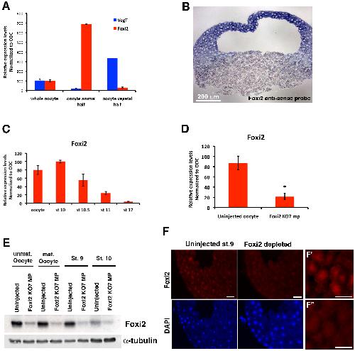 (A) RT-PCR to show relative expression levels of Foxi2 and VegT in either whole oocytes or dissected animal and vegetal halves. Foxi2 and VegT have reciprocal expression domains, with Foxi2 being highly enriched in the animal hemisphere. (B) In situ hybridization of tissue section at the late blastula stage to show distribution of Foxi2 mRNA. (C) RT-PCR analysis of developmental time course to show absence of early zygotic expression of Foxi2. (D) RT-PCR to show degree of depletion of Foxi2 mRNA by antisense oligo. (E�F) Degree of depletion of Foxi2 protein by mRNA depletion; a western blot of oocytes and early stages is shown in (E), and by immunostaining at the late blastula stage in (F). Scale bar in (F) = 50 �m. High magnification Foxi2 immunostaining images from Uninjected (F′) and Foxi2 depleted (F″) embryos. Scale bars in F′ and F″ = 20 �m.