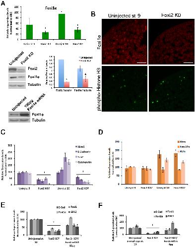 (A�C) Show effect of Foxi2 depletion of Foxi1e mRNA levels at the late blastula and early gastrula stages (A), and on Foxi1e protein levels by western and by densitometric analysis of the western blot (A: middle panels) and immunostaining (B). (A) also shows by western blotting that the anti-Foxi1e antibody cross-reacts with Xenopus Foxi1e protein (lower panel). (C) Shows by RT-PCR the reduced levels of expression of ectodermal genes including Xlim5, E-cadherin, Sox2 and Cytokeratin in control and Foxi2-depleted embryos at the late blastula and early gastrula stages. (D) RT-PCR shows that expression levels of the mesodermal marker Xbra, endodermal marker Xsox17a and ectodermal marker, KLFn are unaffected by Foxi2 depletion. (E�F) show that reduction in expression of the ectoderm marker genes E-cadherin (E-cad), Foxi1e, FoxJ1, and grainyhead-like 3 (GHL3) caused by Foxi2 depletion are rescued by subsequent injection of Foxi2 mRNA (10 pg dose) in both whole embryos (E) and animal caps (F). Scale bar in (B) = 50 �m.