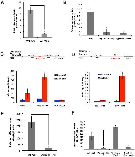 (A) Luciferase activity in blastulae after injecting Xenopus tropicalis Foxi1e promoter-luciferase construct into either animal or vegetal blastomeres at 8-cell stage embryos. (B) Foxi1e promoter activity was measured in blastulae derived from control (uninj) or Foxi2-depleted (4 ng and 5 ng) oocytes. (C,D) Chromatin immunoprecipitation assay. (C) A schematic diagram of Xenopus tropicalis Foxi1e promoter shows potential Foxi2 binding sites and ChIP PCR primer amplicons. Real-time PCR shows significantly higher signal on primer pair −1982:−1734 after immunoprecipation by 6-myc-tagged Foxi2 protein. (D) A schematic diagram of Xenopus laevis Foxi1e promoter shows potential Foxi2 binding sites and ChIP PCR primer amplicons. Real-time PCR shows significantly higher signal on primer pair −1540:−1391 after immunoprecipation by myc-tagged Foxi2 protein. (E) Luciferase activity in blastulae after injecting either wild-type (WT) Xenopus tropicalis Foxi1e promoter constructs or a construct lacking the Foxi2 binding region (Deletion). While wild-type promoter showed its activity (WT Ani), the construct lacking the Foxi2 binding site mutated promoter showed a basal level of promoter activity (Deletion Ani). (F) Luciferase activity in blastulae after injecting Wild-type and Deletion Xenopus tropicalis Foxi1e promoter constructs into vegetal blastomeres. Foxi1e promoter construct lacking the Foxi2 binding site showed a basal level of promoter activity (Deletion Veg 8) while Foxi2 overexpression in vegetal blastomeres had no effect on this mutated construct (Deletion+Foxi2 Veg 8) while wild-type promoter showed increased luciferase activity upon overexpression of Foxi2 (WT+Foxi2 Veg 8).