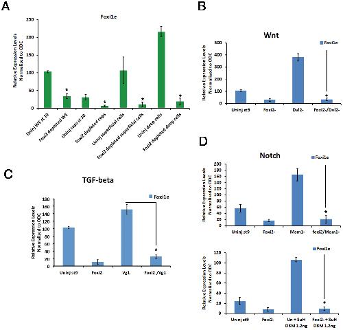 (A) The level of expression of Foxi1e is reduced in Foxi2-depleted animal caps (Foxi2 depleted caps) compared to the caps from control siblings (Uninj caps st.10) at the gastrula stage. Both dissociated superficial and deep cells from Foxi2-depleted embryos expressed reduced levels of Foxi1e mRNA. Note that the expression level of Foxi1e in dissociated superficial cells is much higher than in intact animal caps (Uninj superficial cells). (B) Maternal depletion of Dishevelled2 (Dvl2−) showed upregulation of Foxi1e expression. Double depletion of Foxi2 and Dvl2 (Foxi2−/Dvl2−) showed similar level of expression to Foxi2-depleted embryos (Foxi2−). (C) Maternal depletion of Vg1 (Vg1−) showed upregulation of Foxi1e expression. Double depletion of Foxi2 and Vg1 (Foxi2−/Vg1−) showed a level of expression similar to Foxi2-depleted embryos (Foxi2−). (D) Upper panel; Maternal depletion of transcription factor Mastermind1 (Mam1−) caused upregulation of Foxi1e expression. Double depletion of Foxi2 and Mastermind1 (Foxi2−/Mam1−) showed a similar level of expression as Foxi2 depleted embryos (Foxi2−). Lower panel; The overexpression of Supressor of Hairless (SuH) DNA binding mutant (SuH DBM) mRNA caused upregulation of Foxi1e expression. Foxi1e expression in Foxi2 depleted+1.2 ng of SuH DBM mRNA injected embryos showed similar level of expression as Foxi2 depleted embryos (Foxi2−).