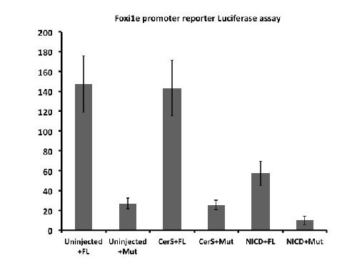 Foxi1e promoter construct is responsive to perturbations of Notch signaling but is not responsive to the influence of Nodal signaling. Either control (FL) or a construct lacking the Foxi2 binding region (Mut) Xenopus tropicalis Foxi1e promoter-luciferase constructs were injected into animal blastomeres of 8-cell stage embryos. When reporter-injected embryos are co-injected with mRNA encoding the Notch intracellular domain (NICD) to activate Notch signaling, there is a 5-fold reduction in luciferase activity of the wild-type promoter construct. Ectopic activation of Notch signaling also gives a 2.5-fold reduction in the activity of the promoter construct that lacks the Foxi2 binding domain (Mut). Foxi1e luciferase activity is unaffected by perturbing Nodal signaling via injection of Cerberus Short (CerS) mRNA.