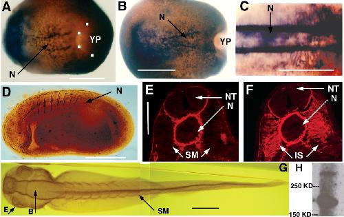 Figure 4. Localization of XF protein in the embryo. XF protein is detected by immunostaining. Anterior is to the left in A-D and G. Dorsal is up in D-F, and G is a dorsal view from above. A: Dorsal view of St-11 whole mount. White squares identify the location of the blastopore lip. B: Dorsal view of St-12 whole mount. C: Dorsal, mid axial-posterior close-up of St-13 whole mount. D: Lateral view of a St-22 whole mount. E: Cross-section through mid-axis of St-22 embryo. Scale bar is for E and F. F: Adjacent cross-section through mid-axis of St-22 embryo, revealing periodic, orthogonoal intersomitic staining. G: Dorsal view of a St-39 embryo. H: Western blot of St-16 embryo extract probed with the JB3 antibody revealing a single band in the size range of fibrillin isoforms (350 kD), as well as a second, smaller band (200 kD). YP, yolk plug; N, notochord; SM, somitic mesoderm; NT, neural tube; IS, intersomitic space; E, eye; B, brain. Scale bars = 0.125 mm (C, E/F), 0.25 mm (A,B), and 0.5 mm (D,G). |