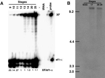 Figure 2. Developmental regulation of XF message. A: RNase Protection assay for XF and elongation factor 1-alpha message levels. One to five staged embryos per lane (note uneven loading, reflected by ef1-alpha signal, required to see early XF expression). Quantitation of XF/control signal is shown. B: Northern blot of staged Xenopus RNA. An 11-kilobase XF message is found at neurula and tailbud stages, but is absent in the egg, indicating that there is no maternal component to the XF message supply in the embryo. |