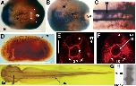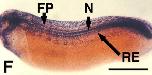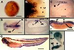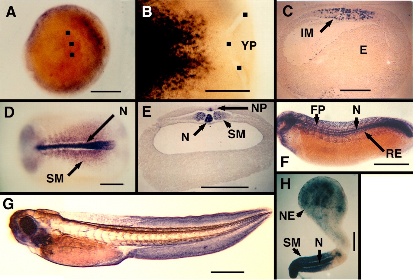 Figure 3. Localization of XF message in the embryo. XF message is detected by whole mount in situ hybridization. Dorsal is to the right in A, and is up in C, E, F, and G. Anterior is to the left in B, C, D, F, and G. A: Vegetal view of a St-10.5 embryo. Black squares are to the left of the blastopore lip. B: Dorsal view of the posterior half of St-11.5 whole mount. Black squares identify the blastopore lip. C: Sagittal section through a St-11.5 whole mount. D: Dorsal view of a St-16 embryo. E: Cross-section through the trunk of a St-16 embryo. F: Lateral view of St-25 embryo. G: Lateral view of St-40 embryo. H: Keller sandwich (St 20) with neural axis running anterior to posterior from top, and mesodermal axis running anterior to posterior from bottom, meeting at middle bend. YP, Yolk plug; N, notochord; SM- Somitic mesoderm; NP, notoplate; RE, roof of endoderm; NT, neural tube; IM, involuting mesoderm; E, endoderm; EB, eye bud; NE, neural extension. Scale bars = 0.25 mm (B-E), 0.5 mm (A,H), 1 mm (F,G). |