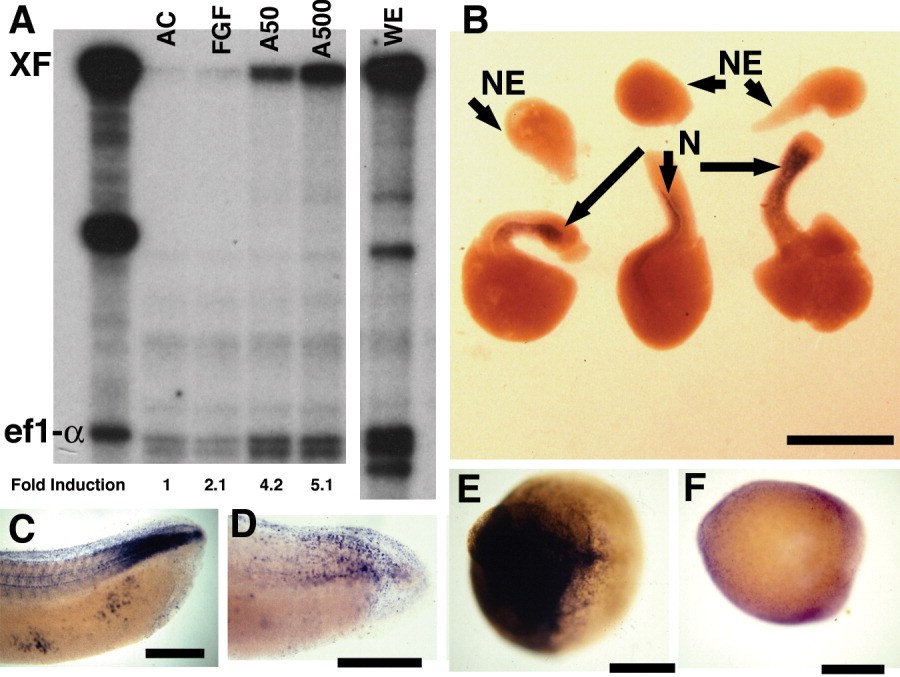 Figure 5. Regulation of XF message expression. A: RNase Protection assay for XF and elongation factor 1-alpha message levels. Animal caps cultured with or without the addition of indicated growth factors revealing regulation of XF expression by FGF and Activin. AC, uninduced animal cap; FGF, caps cultured in 50 ng/ml basic FGF; A50 and A500, caps cultured in 50 or 500 pM Activin A; WE, whole embryo. The first lane shows the input probes, for XF on top and the loading control elongation factor 1-alpha (ef-1 alpha) on the bottom. The middle unidentified band is a third input probe for experiments not presented here. Quantitation of XF/ef-1 alpha signal is shown relative to uninduced animal cap. B: Exogastrulated embryos assayed for XF expression by in situ hybridization. C: Posterior of a normal St-31/32 embryo assayed for XF expression by in situ. D: Posterior of a cell division blocked St-31/32 embryo stained for XF expression exhibits little XF expression in the tailbud. E: Lithium-treated dorsalized embryo exhibits strong XF expression. F: UV-treated ventralized embryo exhibits little XF expression. The embryos in E and F were processed for XF in situ together. Scale bars = 0.25 mm (B,E,F) and 0.5 mm (C,D). N, notochord; NE, neuroectodermal ball. |