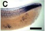 fbn3 (fibrillin 3) gene expression in Xenopus laevis embryo, assayed via in situ hybridization, NF stage 32, tail region only, lateral view, anterior left, dorsal up. |