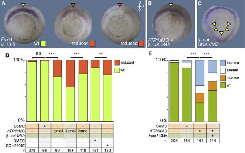 Figure 5. ATP4 Is Required for Wnt/β-cat-Mediated Induction of Foxj1 During Gastrulation(A�C). Reduced mRNA expression of (A) Foxj1 in the SM of ATP4a-morphant or SCH28080-treated embryos was rescued upon coinjection of (B) a β-cat DNA expression construct. (C) Ectopic expression of Foxj1 on the ventral lip following injection of a β-cat DNA expression construct into ventral blastomeres at the four-cell stage (VMZ lineage).(D) Quantification of results.(E) Partial rescue of Pitx2c expression in ATP4a morphants upon coinjection of a Foxj1 DNA expression construct.See also Figure S4. |