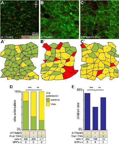 Figure S4. Rescue of Ciliation Rate but Not Cilia Polarization by Foxj1 in ATP4a Morphants, Related to Figure 5Embryos were injected at the 4-cell stage into the DMZ and dorsal explants were prepared at stage 17. Specimens were processed for IHC to assess cilia polarization (A-D), or for SEM analysis to determine the GRP ciliation rate (E).(A�C) IHC using antibodies against acetylated tubulin to visualize cilia (red) and actin (green) to outline cell boundaries. (A) Control uninjected specimen. (B) ATP4a morphant. (C) Coinjection of ATP4aMo and Foxj1 mRNA. (Aâ²-Câ²) Evaluation of results.(D) Quantification of cilia polarization. Note that co-injection of Foxj1 aggravated polarization defects.(E) Ciliation rate. Note that ciliation rate was partially rescued by Foxj1 co-injection. |