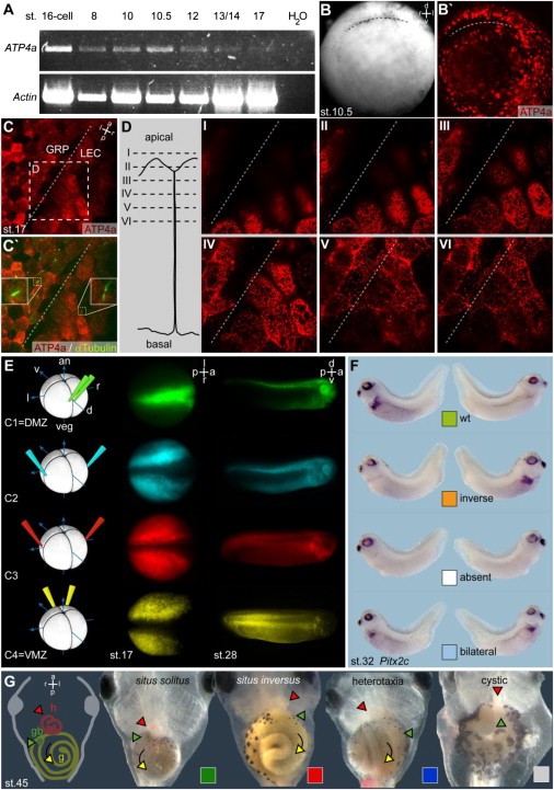 Figure S1. ATP4a Expression, MO Targeting and Morphant Phenotypes, Related to Figure 1(A�D) Expression of ATP4a mRNA (A) and protein (B-D). (A) RT-PCR analysis. Actin served as loading control. Note that mRNA levels decreased but expression persisted through stage 17. (B-D) Immunohistochemistry with an antibody previously used for ATP4a localization in Xenopus (Aw et al., 2008). (B, C) Z-stack projections; (D) individual frames. (B) Gastrula embryo at stage 10.5. ATP4a (Bâ²) was ubiquitously expressed, including the superficial mesoderm on top of the dorsal lip of the blastopore (dotted line). (C) Dorsal explant at stage 17. Ventral view of the GRP at the boundary between the GRP and lateral endodermal crest (LEC) cells (dotted line). Double staining with an antibody against acetylated tubulin (green) in (Câ²) revealed cilia at the GRP and midbodies in the area of the LECs (shown at higher magnification in insets). (D) Optical sections of region outlined in (C) at levels indicated in schematic drawing demonstrated localized staining at membranes as well as in vesicle-like cytoplasmic structures.(E) Injection of lineage tracer rhodamine-B dextran into the marginal region (prospective C-tier of 32-cell embryo) of 4-cell embryos revealed specific targeting of GRP tissue only when dorsal blastomeres were injected close to the dorsal pole (dorsal marginal zone, DMZ, top). More lateral injections of dorsal blastomeres (C2 lineage) or injection of ventral blastomeres (C3 and C4) targeted the intermediate mesoderm (C2/C3), lateral plate mesoderm (C2/C3), and ventral mesoderm (VMZ), respectively.(F and G) Pitx2c expression patterns (F) and organ situs (G) encountered in ATP4a morphants. The outflow tract of the heart and the position of the gall bladder are indicated by green and red arrowheads, respectively, and the direction of gut looping is marked by yellow arrows. Note that morphants occasionally (and dose-dependently) developed cysts, and therefore organ situs could not be determined. |