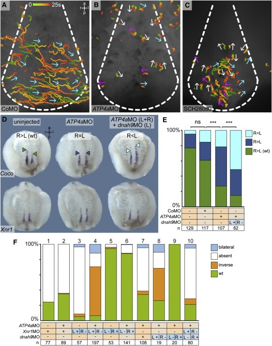 Figure 3. Turbulent Flow in ATP4a Morphants Causes Bilateral Nodal Cascade Induction(A�C) Analysis of bead trajectories in time-lapse movies of dorsal explants from representative (A) CoMO-injected or (B) ATP4aMO-injected embryos and (C) specimen treated with SCH28080. Flow is displayed as GTTs of 25 s length; cf. color bar in (A). Note that trajectories in (B) and (C) project to the left side (indicated with blue arrows) and right side (indicated with pink arrows) of the GRP, whereas GTTs in (A) point uniformly to the left. White arrows represent trajectories running anteriorly or posteriorly.(D) Whole-mount in situ hybridization of stage 20 dorsal explants with probes specific for (top) Coco and (bottom) Xnr1. Left-sided Coco repression was lost in (middle) ATP4a morphants and inverted upon (right) parallel left-sided knockdown of flow. Xnr1 expression was unaffected.(E) Quantification of Coco expression patterns.(F) Quantification of Pitx2c expression patterns in stage 26�32 tadpoles following MO injections into the C1 lineage (dorsal midline-GRP) of four-cell embryos as indicated. Note that the bilateral induction (cf. Figure 1F) in ATP4a morphants was dependent on both the presence of GRP-Xnr1 and ciliary motility.See also Movie S1. |