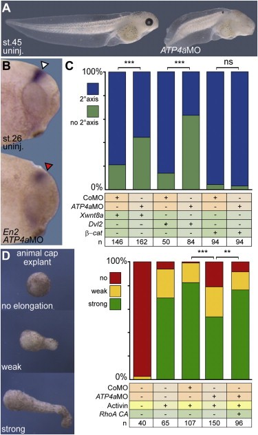 Figure 4. ATP4 Is Required for Canonical and Noncanonical Wnt Signaling(A) Phenotypes of ATP4a morphant tadpoles, which were less pigmented, displayed shortened AP axes, small heads, and reduced eyes.(B and C) Canonical Wnt signaling. (B) Reduced En2 expression at the mid-hindbrain boundary of (bottom) morphant stage 26 tadpole. (C) Xwnt8- and Dvl2-mediated, but not β-cat-induced, twinning requires ATP4a.(D) Noncanonical Wnt signaling. Convergent-extension movements of activin-induced animal cap explants: Reduced elongation in ATP4aMO-injected explants was rescued by coinjection of constitutively active (CA) RhoA. âââVery highly significant. ns, not significant.See also Figure S3. |