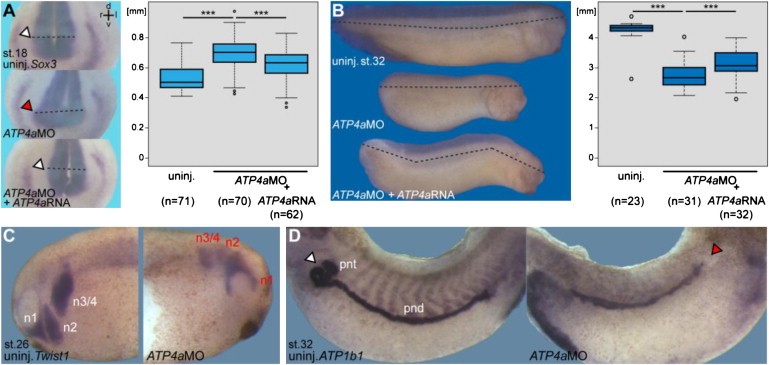 Figure S3. ATP4a Acts on Noncanonical Wnt Signaling, Related to Figure 4(A and B) Convergent extension. (A) Neural tube closure: widening of the neural tube in ATP4a morphants. Embryos were injected unilaterally into the animal right blastomeres at the 4 cell stage, fixed and processed for Sox3 expression to visualize the neural plate by WMISH at stage 18. Staging was according to the progress of neural tube closure on the uninjected (left) side. Note that the widening of the neural plate was partially rescued upon ATP4a co-injection. (B) Shortening of the anterior-posterior (AP) axis. Embryos were bilaterally injected into the DMZ at the 4 cell stage and the AP extension was determined at stage 32. Note that MO-induced shortening was partially rescued by ATP4a co-injection. The width of the neural plate (A) and the length of embryos (B) were measured (as indicated by dashed lines). Results are depicted as box plots.(C) Neural crest cell specification and migration: right-sided ATP4aMO-injection resulted in reduced and altered Twist1 mRNA expression at stage 26 (n1-n3/4; neural crest migratory streams).(D) Right-sided pronephric tubule (pnt) defects upon unilaterally right-sided ATP4aMO-injection, as demonstrated by WMISH using the pronephros marker gene ATP1b1. d, dorsal; l, left; pnd, pronephric duct; pnt, pronephric tubule; r, right; v, ventral. âââ, very highly significant. Numbers in brackets represent number of analyzed specimens. |