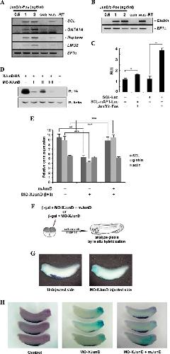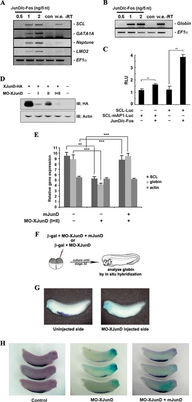 AP-1JunD/c-Fos is required for hematopoiesis. A and B, co-expression of junD and c-fos induces hematopoietic makers (SCL, GATA1A, Neptune, and LMO2) and globin. Animal caps, explanted from embryos injected with the indicated concentration of mRNAs encoding junD or/and c-fos, were incubated until stages 18-20 (A) or 24-28 (B) and used for qRT-PCR analysis. C, co-expression of junD and c-fos enhances the promoter activities of the SCL but not the mutant SCL-mAP1. Embryos injected with the SCL- or SCL-mAP1-luciferase reporter gene alone or together with 2 ng of junD and c-fos were incubated until stages 18-20. Luciferase activity was measured. Values are shown as means ± S.D. from at least three independent experiments. RLU, relative luciferase activity. D, MO junD (20 ng) specifically knocks down the translation of the overexpressed C-terminal HA-tagged XJunD protein at stage 18. Actin served as a specificity control. E, mouse junD rescues SCL and globin, which are repressed by MO junD expression without changing the dorsal mesoderm marker, actin. qRT-PCR analysis of whole embryos expressing MO junD (20 ng) alone or in combination with 1 ng of mouse junD at stages 20-24. F, illustration of the scheme of the experiment. One blastomere of two-cell embryos was injected with mRNA encoding β-galactosidase together with MO junD (20 ng) or mouse junD (1 ng) (mjunD) as illustrated. G and H, embryos were stained for β-galactosidase (β-gal) activity at stage 30 (blue stain) followed by in situ hybridization analysis of globin expression (purple stain). G, the expression of globin is repressed in the MO junD-injected side. H, mouse junD mRNA (mjunD) rescues globin expression that is repressed by expression of MO junD. EF1α, loading control; w.e., whole embryo was used as a positive control for PCR; âRT, control reaction without reverse transcriptase; con, animal cap samples obtained from non-injected embryos. **, p value < 0.01; ***, p value < 0.001. IB, immunoblot.