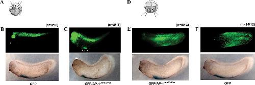 AP-1JunD/c-Fos converts dorsal-fated tissue into ventral-fated tissue (ventralblood island). A and D, illustration of the scheme of the experiment. GFP mRNA (200 pg, B) only (B and F) or GFP together with AP-1 (junD and c-fos, 500 pg) mRNA (C and E) were injected into dorsal animal blastomeres (D1) or ventral animal blastomeres (V1) of eight-cell stage embryos and then cultured until stages 28�30. Embryos were fixed, and GFP expression was observed by green fluorescent microscopy. B and C, dorsally expressed GFP (B, upper panel) is partially transferred into the ventralblood island region (C, three arrows in upper panel). E and F, embryos injected with either GFP alone (F, upper panel) or together with AP-1JunD/c-Fos (E, upper panel) show a similar expression pattern of GFP, which is expressed at the ventroposterior epidermis. The ventralblood island is indicated by in situ hybridization of globin (B�F, lower panel). The number (n) of phenotypes for each group is presented.