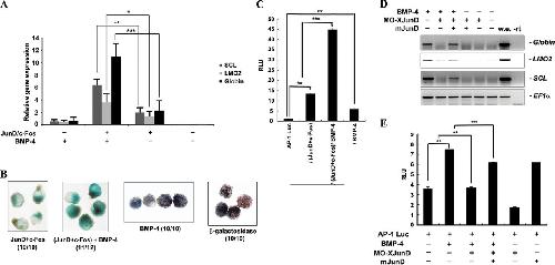 AP-1JunD/c-Fos is required for hematopoiesis induced by BMP-4. A and B, animal caps, explanted from embryos injected with the indicated mRNAs were incubated until stage 20-24 and used for qRT-PCR analysis (A) or benzidine staining (B). A, AP-1JunD/c-Fos and BMP-4 synergistically induce hematopoietic markers and globin. B, blood formation stained by benzidine is synergistically enhanced by AP-1JunD/c-Fos and BMP-4. C, the activity of the (AP-1)4-luciferase reporter gene is synergistically activated by co-injection of AP-1JunD/c-Fos and BMP-4. An (AP-1)4-luciferase assay using animal cap explants derived from embryos injected with the (AP-1)4-luciferase reporter gene alone or in combination with the indicated mRNA was performed. Luciferase activity was measured at stage 18. Values are averages from at least three independent experiments. RLU, relative luciferase activity. D, animal caps, explanted from embryos injected with the indicated mRNAs or MO junD (20 ng), were incubated until stage 20�24 and used for qRT-PCR analysis. MO JunD selectively blocks BMP-4-induced expression of globin, LMO2, and SCL. Injection of mouse junD mRNA rescues the BMP-4 induction of globin, LMO2, and SCL as well as the activity of the (AP-1)4-luciferase reporter gene in MO junD-injected animal caps (E). EF1α, loading control; w.e., whole embryo was used as a positive control for PCR; ârt, control reaction without reverse transcriptase. **, p value < 0.01; ***, p value < 0.001.