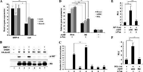 Transcriptional and post-translational modification of AP-1JunD/c-Fos by BMP-4 is required for hematopoiesis. A, BMP-4 activates the transcription of junD, but not c-fos. Xvent1 (ventral marker) was used as a positive control for BMP-4. Animal caps derived from embryos injected with the indicated mRNA were excised and cultured until stage 13 and used for qRT-PCR analysis. con, animal cap samples obtained from non-injected embryos. B, BMP-4 enhances phosphorylation of XJunD at serine 67; in contrast, dominant-negative BMP receptor inhibits the phosphorylation of XJunD. Embryos injected with wild-type HA-junD (W) or mutant HA-junD (M2) alone or in combination with 1 ng of BMP-4 or dominant-negative BMP receptor mRNA were used for Western blotting. Phosphorylation of JunD was analyzed by Western blot using anti-phospho-Jun (α-73). Western blotting with anti-HA shows that equal amounts of expressed JunD were loaded. C, band density was measured using the NIH ImageJ program. D�F, animal caps, explanted from embryos injected with the indicated mRNAs or in combination with the (AP-1)4-luciferase reporter gene or SCL-luciferase reporter gene, were used for qRT-PCR analysis (D) and the luciferase assay (E and F). The concentration of each mRNA injected into embryos was 1 ng. D, AP-1M2JunD/c-Fos shows a lower induction of hematopoietic markers and globin, compared with AP-1JunD/c-Fos. E and F, the AP-1- and SCL-luciferase activities are consistent with D. Data are shown as means ± S.D. of values from at least three independent experiments. RLU, relative luciferase activity. **, p value < 0.01; ***, p value < 0.001.