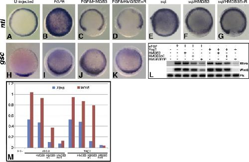 The high mobility group (HMG) proteins constitute a superfamily of nuclear proteins that regulate the expression of a wide range of genes through architectural remodeling of the chromatin structure, and the formation of multiple protein complexes on promoter/enhancer regions, but their function in germ layer specification during early development is not clear. Here we show that hmgb genes regulate mesoderm formation and dorsoventral patterning both in zebrafish and Xenopus early embryos. Overexpression of hmgb3 blocks the expression of the pan-mesoderm gene no tail/Xbra and other ventrolateral mesoderm genes, and results in embryos with shortened anteroposterior axis, while overexpression of hmgb3EnR, which contains the engrailed repressor domain, most potently repressed no tail expression and mesoderm formation. However, hmgb3VP16, which contains the transcriptional activation domain of VP16, had an opposite effect, indicating that hmgb3 may function as a repressor during mesoderm induction and patterning. In addition, we show that hmgb3 inhibits target gene expression downstream of mesoderm-inducing factors. Furthermore, using reporter gene assays in Xenopus whole embryos, we show that hmgb3 differentially regulates the activation of various mesendoderm reporter genes. In particular, it up-regulates the goosecoid, but inhibits the Xbra reporter gene activation. Therefore, our results suggest that hmgb genes may function to fine-tune the specification and/or dorsoventral patterning of mesoderm during zebrafish and Xenopus development.