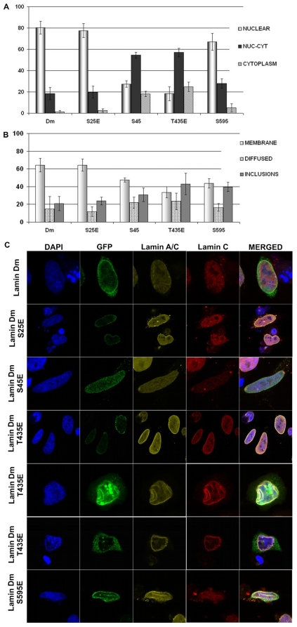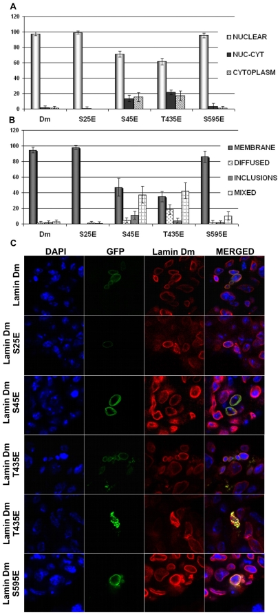 Lamins' functions are regulated by phosphorylation at specific sites but our understanding of the role of such modifications is practically limited to the function of cdc 2 (cdk1) kinase sites in depolymerization of the nuclear lamina during mitosis. In our study we used Drosophila lamin Dm (B-type) to examine the function of particular phosphorylation sites using pseudophosphorylated mutants mimicking single phosphorylation at experimentally confirmed in vivo phosphosites (S(25)E, S(45)E, T(435)E, S(595)E). We also analyzed lamin C (A-type) and its mutant S(37)E representing the N-terminal cdc2 (mitotic) site as well as lamin Dm R(64)H mutant as a control, non-polymerizing lamin. In the polymerization assay we could observe different effects of N-terminal cdc2 site pseudophosphorylation on A- and B-type lamins: lamin Dm S(45)E mutant was insoluble, in contrast to lamin C S(37)E. Lamin Dm T(435)E (C-terminal cdc2 site) and R(64)H were soluble in vitro. We also confirmed that none of the single phosphorylation site modifications affected the chromatin binding of lamin Dm, in contrast to the lamin C N-terminal cdc2 site. In vivo, all lamin Dm mutants were incorporated efficiently into the nuclear lamina in transfected Drosophila S2 and HeLa cells, although significant amounts of S(45)E and T(435)E were also located in cytoplasm. When farnesylation incompetent mutants were expressed in HeLa cells, lamin Dm T(435)E was cytoplasmic and showed higher mobility in FRAP assay.
