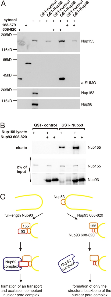 Nuclear pore complexes (NPCs) are large macromolecular assemblies that control all transport across the nuclear envelope. They are formed by about 30 nucleoporins (Nups), which can be roughly categorized into those forming the structural skeleton of the pore and those creating the central channel and thus providing the transport and gating properties of the NPC. Here we show that the conserved nucleoporin Nup93 is essential for NPC assembly and connects both portions of the NPC. Although the C-terminal domain of the protein is necessary and sufficient for the assembly of a minimal structural backbone, full-length Nup93 is required for the additional recruitment of the Nup62 complex and the establishment of transport-competent NPCs.