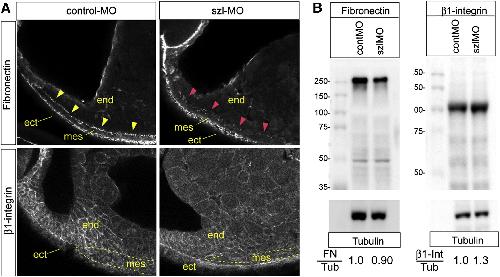 Figure 7. Loss of FN Matrix in szl-MO(A) FN and β1-integrin immunostaining (10 μm confocal slice) of cont-MO and szl-MO-injected foreguts at stage 180 shows that the FN matrix between the endoderm (end) and mesoderm (mes) (yellow arrows) is absent in szl-MO (red arrows). Yellow dashed lines outline the precardiac lateral plate mesoderm.(B) Western blots of foregut explants show no obvious degradation of FN or β1-integrin in Szl morphants. The relative FN/tubulin and integrin/tubulin levels in the szl-MO compared to the cont-MO, which was set to 1.0 is indicated.See also Figure S5. |