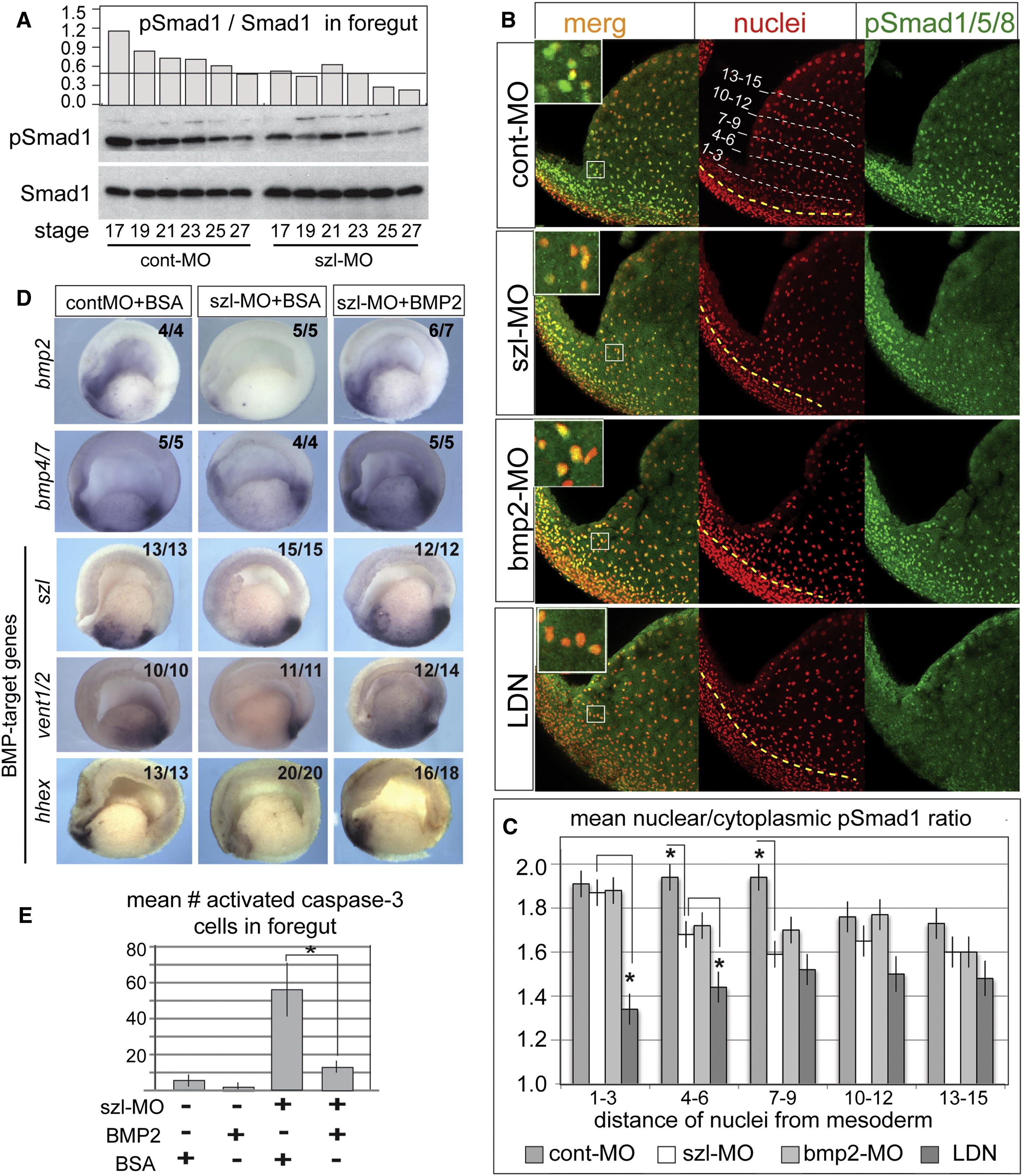 Figure 5. Szl Is Required to Maintain Robust BMP Signaling in the Foregut(A) Western blot of pSmad1/5/8 and total Smad1 in foregut explants from cont-MO and szl-MO embryos at different stages shows reduced BMP signaling in Szl morphants.(B) Szl-depleted embryos exhibit reduced pSmad1 signaling in the foregut. Fifty micrometer confocal Z-projections of pSmad1/5/8 (green) and nuclei (red) in stage 20 sibling embryos injected with cont-MO (20 ng), szl-MO (15 ng), or bmp2-MO (20 ng) or treated with BMP-receptor inhibitor LDN193189 (40 μM). Yellow dashed lines indicate the mesoderm-endoderm boundary. Dashed white lines in nuclear channel of the cont-MO illustrate the subregion of the foregut, based on number of nuclei from the mesoderm. See also Figure S3.(C) Szl- and Bmp2-depleted embryos have reduced pSmad1 levels in the deep foregut endoderm. Mean nuclear/cytoplasmic ratio of pSmad1 immunostaining intensity SEM in foregut cells at different distances from the mesoderm, quantitated from 80 μm Z-projections from four sibling embryos/condition. âSignificantly different from szl-MO, p < 0.05.(D) Expression of bmp2, bmp4/7, and BMP-target genes szl, vent1/2, and hhex were downregulated by injection of the szl-MO (15 ng) and rescued by subsequent injection of recombinant BMP2 protein (4 ng) into the foregut at stage 12.(E) Mean number of activated caspase-3 positive foregut cells SEM (n = 5 embryos / condition), âp < 0.01 in Student t tests.Error bars reflect SEM. |