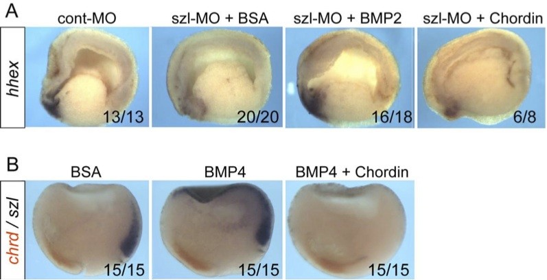 Figure S4. Injection of Chordin protein does not rescue the foregut specific Szl loss of function phenotype. (A) hhex expression in embryos injected into the anterior mesendoderm with control or szl-MO (15 ng) at the 16-cell-stage followed by injection into the foregut blastocoel at stage 12-13 with either recombinant BSA (40 ng), BMP2 (20 ng) or Chordin (40 ng) proteins. (B) In situ hybridization of chordin and szl expression in bisected gastrula that have been injected into the blastocoel at stage 9 with BSA (40 ng), BMP4 (20 ng) or BMP4 (20 ng) + Chordin (40 ng) confirms that the Chordin protein used in (A) was biologically active and can repress the ventralizing activity of BMP4. |