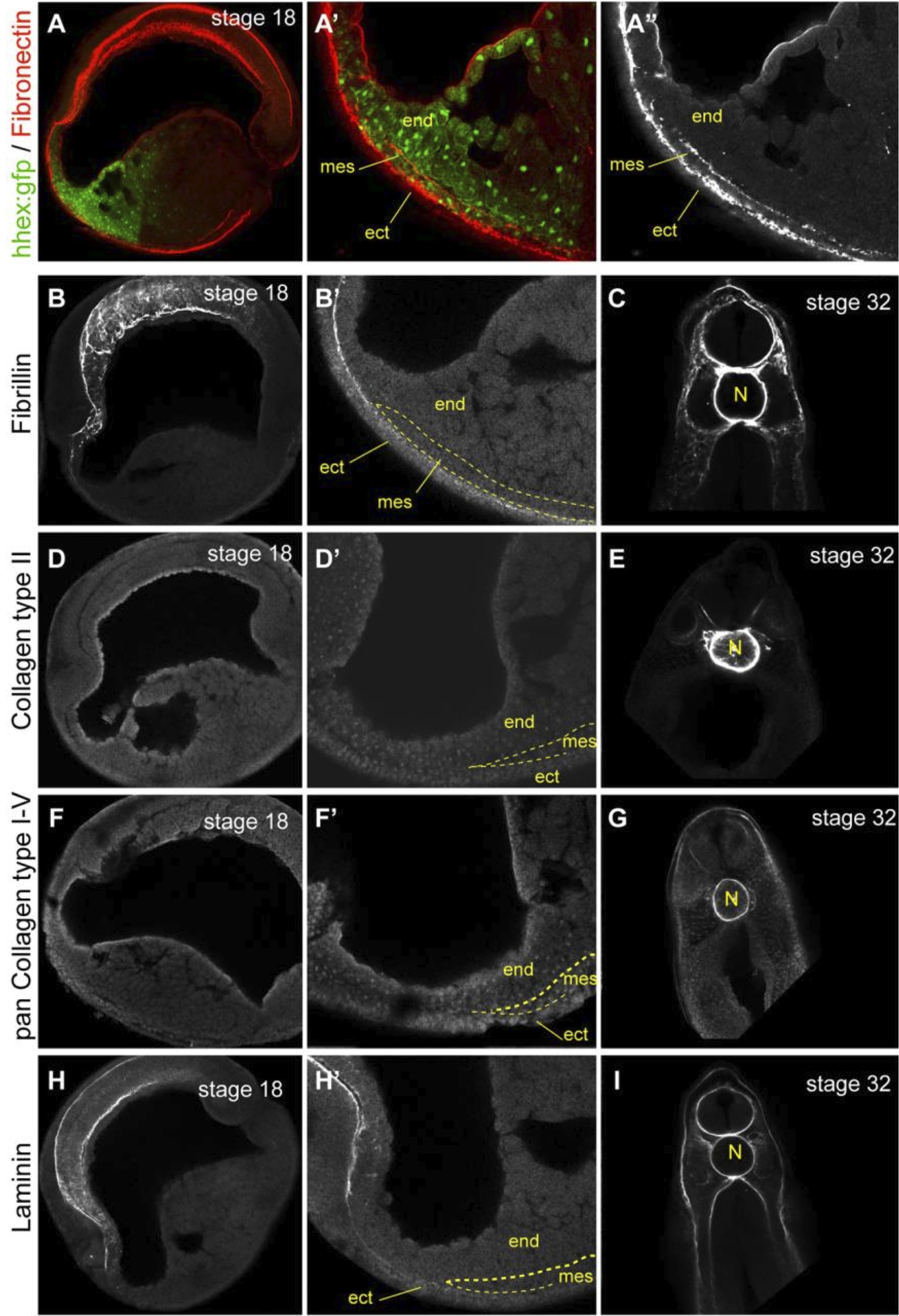 Figure S5. Fibronectin expression in the Xenopus foregut. (A) Immunostaining of FN (red) and GFP (green) in hhex:gfp transgenic stage 18 embryos reveals a FN fibril layer between the precardiac mesoderm (mes) and the foregut endoderm (end) as well as between the mesoderm and ectoderm (ect). (A) FN channel only. Other ECM proteins were not detected in the foregut including: Fibrillin (B and B, Collagen Type II (D and D, pan-Collagen types I-V (F and F and Laminin (H and H. Positive control staining of stage 32 embryos revealed strong expression around the notochord (N) and neural tube (C, E, G, and I). All images are 10 m confocal slices. |
