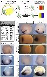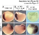 Figure S2. Targeted injection of the szl-MO into the foregut does not disrupt gastrula axial pattering. Embryos were either (A) uninjected or injection with the szl-MO (20 ng) into (B) C1/D1 cells at the 16-cell stage, which give rise to the foregut or (C) injected into ventral cells at the 4-cell stage. Injection of szl-MO into the C1/D1 presumptive foregut (B) did not alter gastrula stage axial pattering as indicated by no change in hhex or szl expression in the organizer or ventral mesoderm respectively, and no alterations in pSmad1/5/8 immunostaining. In contrast injection of the szl-MO into the ventral cells of the 4-cell- stage embryo resulted in axial pattering defects with elevated pSmad1/5/8, expanded expression of szl (a bmp-target) and a loss of hhex, all of which are consistent with previously published work showing that Szl in the gastrula mesoderm regulates axial pattering by repressing BMP signaling. Thus injection of the szl-MO into different regions of the embryos reveals distinct temporal and spatial Szl functions. |