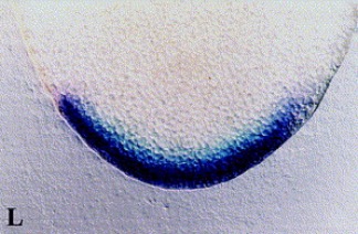 Fig. 3. The distribution of xNAP1L mRNA in embryos. Embryos were hybridised either with sense (A and D, as controls) or antisense (B, C, E, F, G, H, I, J, K) xNAP1L probes. (B and C) Lateral and animal views, respectively, of stage 6 embryos with staining predominantly in the animal half, the mRNA is consistently perinuclear (arrowed in (C)). (E and F) Whole-mount and sectioned gastrula stage embryos, xNAP1L mRNA remains mainly at the animal pole and on the section can also be seen in the involuting mesoderm, the dorsal lip is arrowed in (F). (G) Anterior view of a stage 18 embryo, the mRNA is detectable in the neural plate and also on the ventral part of the embryoposterior to the cement gland. (H) Anterior view of a stage 23 embryo, xNAP1L is expressed in the eyes, brain, neural tube and branchial arches. (I) Lateral view of a stage 26 embryo, staining is visible in the tailbud as well as the neural system, eye and branchial arches. (J) Transverse section through the posteriorhead region of a stage 30 embryo, xNAP1L mRNA levels are highest in the ectoderm but detectable also in the lens (l) and branchial arches (ba), staining is completely absent from the cement gland (cg). (K) A stage 33 embryo showing staining as before and also in the lateral plate and blood islands (arrowed). (L) Double in situ showing globin (turquoise) and xNAP1L (purple) in a transverse section of the ventral region of a stage 33 embryo, xNAP1L expression is in the ectoderm precisely overlying the v.b.i. and in its outer cells.
