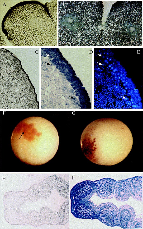 Fig. 5. xNAP1L is cytoplasmic prior to the MBT but enters nuclei subsequently. (AâF) Embryo sections were used for immunohistochemistry with either a pre-immune serum (A, C and E) or the anti-xNAP1L serum (B, D, F and G). (AâD) show sections from stage 6 embryo blastomeres and staining is visible throughout the cells except for the nuclei (upper panels) which are highlighted by DAPI staining (lower panels). (EâF) show sections through gastrula stage embryos, staining is strongest in the ectodermal and mesodermal cells but also seen in the endoderm. In all layers there is now nuclear staining (examples are arrowed in (F)) coincident with DAPI fluorescence (G). (H and I) Embryos were injected at the two cell stage with 100Â pg of synthetic RNA encoding hemaglutanin-tagged xNAP1L and allowed to develop until stage 7(H) or 9(I). They were then fixed and the exogenous protein was detected by immunohistochemistry. In the stage 7 embryos staining is absent from nuclei (arrowed in (G)) but by stage 9 punctuate staining of nuclei is seen, although there is still substantial signal in the cytoplasm.