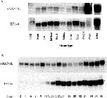 Fig. 2. xNAP1L mRNA in adult tissues and during embryonic development. (A) One gram of the above tissues was used to prepare total RNA and 10 μg of each sample was separated on a formaldehyde containing agarose gel prior to the detection of xNAP1L mRNA by Northern blotting. (B) RNA was prepared from sets of 20 embryos at the stages shown and RNA equivalent to two embryos was separated on a formaldehyde containing agarose gel prior to the detection of xNAP1L mRNA by Northern blotting.