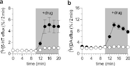 FIGURE 2. Ibogaine does not elicit an amphetamine-like releasing action in SERT and DAT.