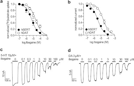 FIGURE 3. Inhibition of substrate transport and induced currents by ibogaine.