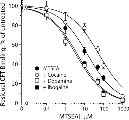 FIGURE 4. Reactivity of the DAT cytoplasmic pathway is increased by ibogaine. Ser-262 in DAT, corresponding to the cytoplasmic pathway residue Ser-277 identified in SERT, was mutated to cysteine in the X5C background (42). Membrane fragments from HeLa cells expressing DAT X5C-S262C were treated with the indicated concentrations of MTSEA for 15 min in the presence or absence of 10 μm cocaine, 10 μm DA, or 20 μm ibogaine as indicated, and then assayed for residual [3H]CFT binding as previously described for SERT (43, 54). From the MTSEA concentrations required for half-maximal inactivation, the rate constants for inactivation were 82 ± 3 s−1