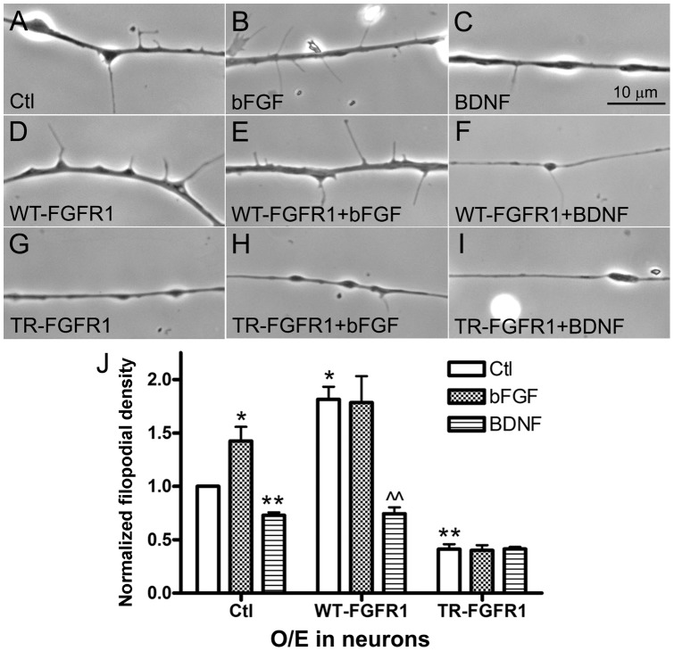 Figure 4. Opposite effects of bFGF and BDNF signaling on filopodial formation in spinal neurons.Spinal neurons were incubated in control medium (A) or medium containing (B) bFGF or (C) BDNF. Filopodial assembly was enhanced and suppressed by bFGF and BDNF respectively (J). Neurons expressing WT-FGFR1 or TR-FGFR1 were also maintained in control medium (D, G) or medium containing bFGF (E, H) or BDNF (F, I). WT-FGFR1 expression elevated the basal filopodial density in neurons, and this was not increased by bFGF-addition but was suppressed by BDNF-treatment (J). TR-FGFR1 expression blocked both basal and bFGF-induced formation of filopodia in neurons, and BDNF did not further reduce filopodial growth (J). The density of filopodia in control neurons (A) was used for normalizing all other filopodial density values. Mean and SEM shown; t test: *p<0.05 and **p<0.01, compared with untreated Ctl; ??p<0.01, compared to untreated WT-FGFR1-neurons.