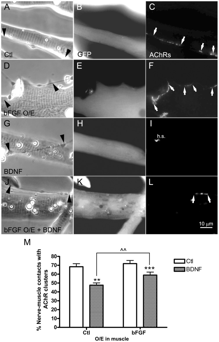 Figure 7. Reciprocal regulation of NMJ formation by bFGF/NT-signaling.Normal spinal neurons were cocultured with muscle cells expressing GFP (A–C and G–I) or GFP plus bFGF (bFGF O/E; D–F and J–L) and maintained in control medium (A–F) or medium with added BDNF (G–L). Neurons induced AChR clusters equally well in GFP- and bFGF-muscle cells (C, F), and BDNF-treatment inhibited synaptic AChR clustering in both cases (I, L). The inhibitory effect of BDNF, however, was weaker when muscle cells expressed excess bFGF, and in these cases nerve-muscle contacts with AChR were more readily found (L). Muscle cells in which nerves induced new AChR clusters lacked spontaneously occurring AChR aggregates (also called hot-spots); when AChR aggregation at innervation sites was compromised, AChR hot-spots were retained (h.s. in panel I). Synaptogenesis was quantified in terms of the percentages of nerve-muscle contacts with AChR clusters (M). Mean and SEM shown; t test: **p<0.01 and ***p<0.001, compared to cocultures with normal muscle cells; ??p<0.01, compared with BDNF-treated cocultures using bFGF-overexpressing muscle cells. Arrowheads point to nerve tracks, arrows to nerve-induced AChR clusters.