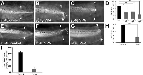 Fig. 1. Valproic acid (VPA) inhibits tail regeneration in both larval and embryonic stage Xenopus laevis tadpoles and VPA inhibits HDACs in regenerating X. laevis. (AâC) Examples of tadpole larval tails five days after amputation at stage 48, white arrowheads indicate the approximate cut site. (A) Untreated tadpole showing full regeneration. (B) Tadpole treated with 0.1 mg/ml VPA showing partial regeneration (white arrow), (C) Example of tadpole treated with 0.1 mg/ml VPA that failed to undergo any regeneration. (D) Bar graph showing mean tail regeneration score out of 10 (mean RS) in stage 48 tadpoles treated with differing concentrations of VPA. All concentrations shown significantly inhibited regeneration (ââIndicates t-test p value of <0.01), full data and analysis is shown in Table 1. (E)â(G) Examples of embryo tails five days after amputation at stage 40, white arrowheads indicate the approximate cut site. (E) Example of untreated embryo showing full regeneration. (F) Example of embryo treated with 0.2 mg/ml VPA showing partial regeneration and characteristic âpoodleâ phenotype, consisting of fintissue bubble formed at the end of the notochord (white arrow). (G) Example of stage Stage 40 embryo treated with 0.2 mg/ml VPA showing failed regeneration. (H) Graph showing mean tail regeneration score out of 10 (mean RS) in stage 40 tadpoles treated with 0.2 mg/ml VPA. This concentration significantly inhibited regeneration (ââIndicates t-test p value of <0.01). (I) Colourimetric HDAC activity assay in stage 40 embryos treated with VPA (0.2 mg/ml) for 24 h post tail amputation, where HDAC activity is indicated by the amount deacetylated lysine standard per ng of total nuclear protein.