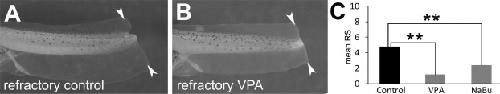 Fig. 2. HDAC inhibitors further inhibit tail regeneration in refractory stage Xenopus laevis. Stage 46/47 tadpoles are normally unable to regenerate tails following partial amputation. (A and B) Tadpole tails shown five days after amputation of the posterior 30â50% during the refractory period. White arrowheads indicate approximate level of amputation. (A) Example of failed regeneration in control, untreated tadpole. (B) Representative tadpole treated with 0.2 mg/ml VPA. (C) Bar graph showing mean tail regeneration score out of ten (mean RS) in refractory stage tadpoles. Despite the low background regeneration in controls at this stage, treatment with VPA or NaBu still significantly inhibited regeneration (ââIndicates t-test p value of <0.01). Full data and analysis is shown in Table 3.