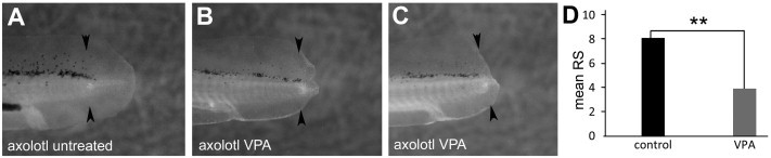 Fig. 4. VPA inhibits tail regeneration in stage 46 Ambystoma mexicanum. (AâC) stage 46 axolotl larvae tails shown 7 days after amputation of the posterior third of the tail. Arrowheads indicate the approximate cut site (A) untreated tail showing full regeneration. (B) Tail of axolotl larva treated with 0.2 mg/ml VPA post amputation showing example of partial regeneration. (C) Tail of axolotl larva treated with 0.2 mg/ml VPA post amputation showing example of failed regeneration. (D) Bar graph showing mean tail regeneration score out of ten (mean RS) in stage 46 axolotl larvae treated with VPA (0.2 mg/ml) compared to untreated controls. (ââIndicates t-test p value of <0.01). Full data and analysis is shown in Table 4.