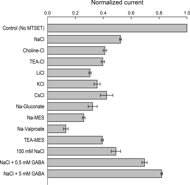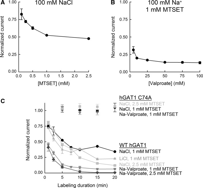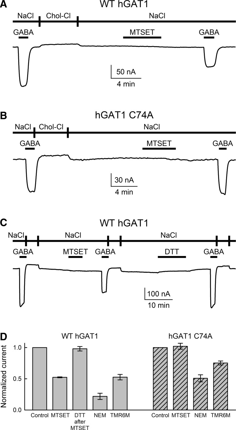 The aims of this study were to optimize the experimental conditions for labeling extracellularly oriented, solvent-exposed cysteine residues of γ-aminobutyric acid transporter 1 (GAT1) with the membrane-impermeant sulfhydryl reagent [2-(trimethylammonium)ethyl]methanethiosulfonate (MTSET) and to characterize the functional and pharmacological consequences of labeling on transporter steady-state and presteady-state kinetic properties. We expressed human GAT1 in Xenopus laevis oocytes and used radiotracer and electrophysiological methods to assay transporter function before and after sulfhydryl modification with MTSET. In the presence of NaCl, transporter exposure to MTSET (1-2.5 mM for 5-20 min) led to partial inhibition of GAT1-mediated transport, and this loss of function was completely reversed by the reducing reagent dithiothreitol. MTSET treatment had no functional effect on the mutant GAT1 C74A, whereas the membrane-permeant reagents N-ethylmaleimide and tetramethylrhodamine-6-maleimide inhibited GABA transport mediated by GAT1 C74A. Ion replacement experiments indicated that MTSET labeling of GAT1 could be driven to completion when valproate replaced chloride in the labeling buffer, suggesting that valproate induces a GAT1 conformation that significantly increases C74 accessibility to the extracellular fluid. Following partial inhibition by MTSET, there was a proportional reduction in both the presteady-state and steady-state macroscopic signals, and the functional and pharmacological properties of the remaining signals were indistinguishable from those of unlabeled GAT1. Therefore, covalent modification of GAT1 at C74 results in completely nonfunctional as well as electrically silent transporters.