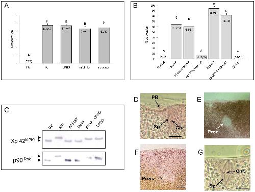 Figure 4. SNAP induced parthenogenetic activation is calcium-dependent.Effects of 5 mM SNAP application on mature oocyte in ND96 (black triangles) or in ND96 with 50 µM BAPTA-AM (white squares) (A) or in presence of CPTIO (B). Typical results are depicted. Fluorescence was expressed in arbitrary units and background and auto-fluorescence were subtracted. SNAP superfusion, which started at time â=â5 minutes, was responsible for a rise of intracellular calcium fluorescence. The latter was abolished by presence of CPTIO (C) Effect of calcium chelator on SNAP induced activation. Histogram showing percentages of activated oocytes after 2 hours treatment with 5 mM SNAP or 10 uM A23187 supplemented 50 µM or 100 µM BAPTA-AM. Oocyte in control group were treated for 2 hours in clear ND96. Error bands represent ±SEM values. Different superscripts indicate significant diferences (P<0.05). Data are shown as mean percentage of activation of minimally four independent experiments. (D) Percentages of parthenogenetic activated oocytes after 2 hours treatment with 5 mM SNAP in ND96 medium, calcium free medium (CaFree) and calcium limited medium (CaLim). Error bands represent ±SEM values. Different superscripts indicate significant differences (P<0.05). Data are shown as mean percentage of activation of minimally four independent experiments. (E) Western blot analysis. After 2 hours oocytes were taken off, homogenized in lysis buffer, and immunoblotted with antibodies against Xp42Mpk1 and p90Rsk. (F) Releasing of nitric oxide in calcium restricted mediums. Nitric oxide contents after SNAP treatment was determined in ND96, CaLim and CaFree mediums by colorimetric measurement of NO nitric oxide metabolites, nitrites and nitrates (NO3â/NO2). Each measurement was repeated three times. Different superscripts indicate significant differences (P<0.05). |