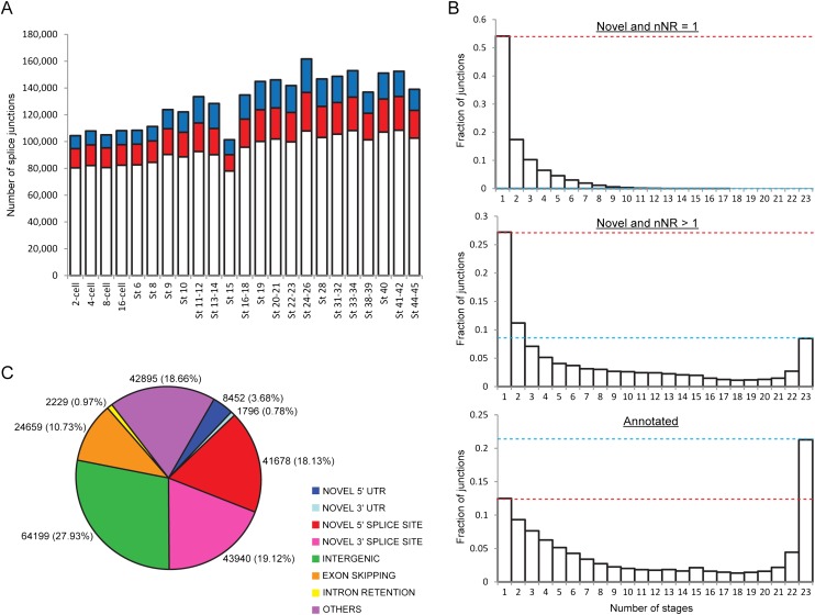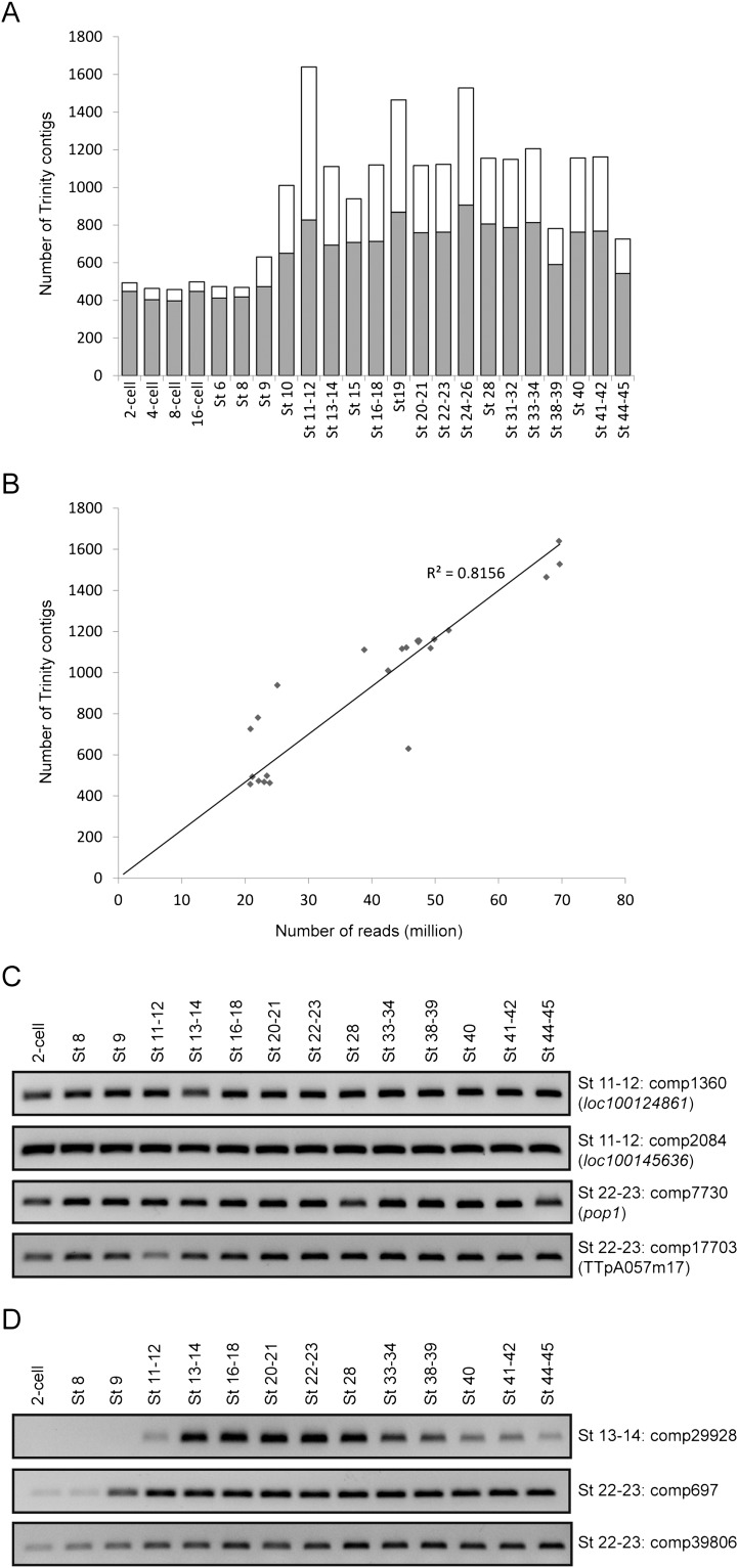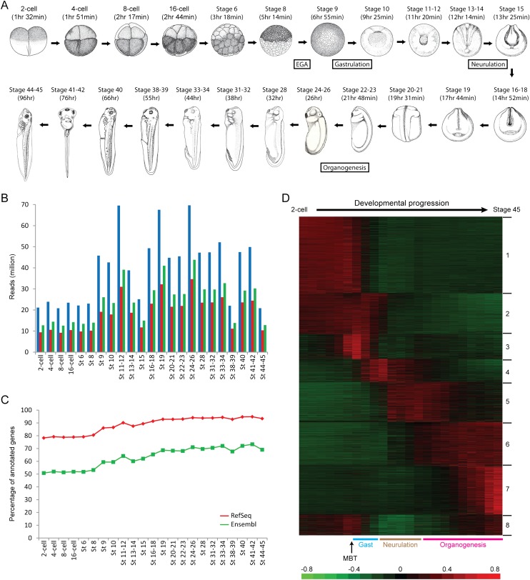 The Xenopus embryo has provided key insights into fate specification, the cell cycle, and other fundamental developmental and cellular processes, yet a comprehensive understanding of its transcriptome is lacking. Here, we used paired end RNA sequencing (RNA-seq) to explore the transcriptome of Xenopus tropicalis in 23 distinct developmental stages. We determined expression levels of all genes annotated in RefSeq and Ensembl and showed for the first time on a genome-wide scale that, despite a general state of transcriptional silence in the earliest stages of development, approximately 150 genes are transcribed prior to the midblastula transition. In addition, our splicing analysis uncovered more than 10,000 novel splice junctions at each stage and revealed that many known genes have additional unannotated isoforms. Furthermore, we used Cufflinks to reconstruct transcripts from our RNA-seq data and found that ∼13.5% of the final contigs are derived from novel transcribed regions, both within introns and in intergenic regions. We then developed a filtering pipeline to separate protein-coding transcripts from noncoding RNAs and identified a confident set of 6686 noncoding transcripts in 3859 genomic loci. Since the current reference genome, XenTro3, consists of hundreds of scaffolds instead of full chromosomes, we also performed de novo reconstruction of the transcriptome using Trinity and uncovered hundreds of transcripts that are missing from the genome. Collectively, our data will not only aid in completing the assembly of the Xenopus tropicalis genome but will also serve as a valuable resource for gene discovery and for unraveling the fundamental mechanisms of vertebrate embryogenesis.