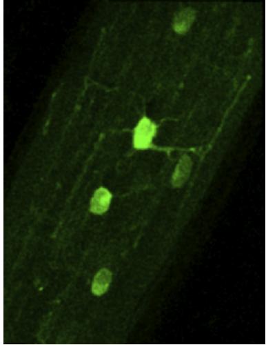 Movie 1 (still from). Faint detection of GFP in myelin along optic nerve axons of stage 50 pMBP-eGFP- NTR transgenic tadpole. At this early developmental stage, the wrapping process is ongoing, therefore myelin is still not completely compact and this allows diffusion of GFP in the myelin cytoplasmic compartment. This movie represents the Z-projection of 17 successive optical sec- tions across the thickness of the optic nerve imaged by two-photon microscopy.