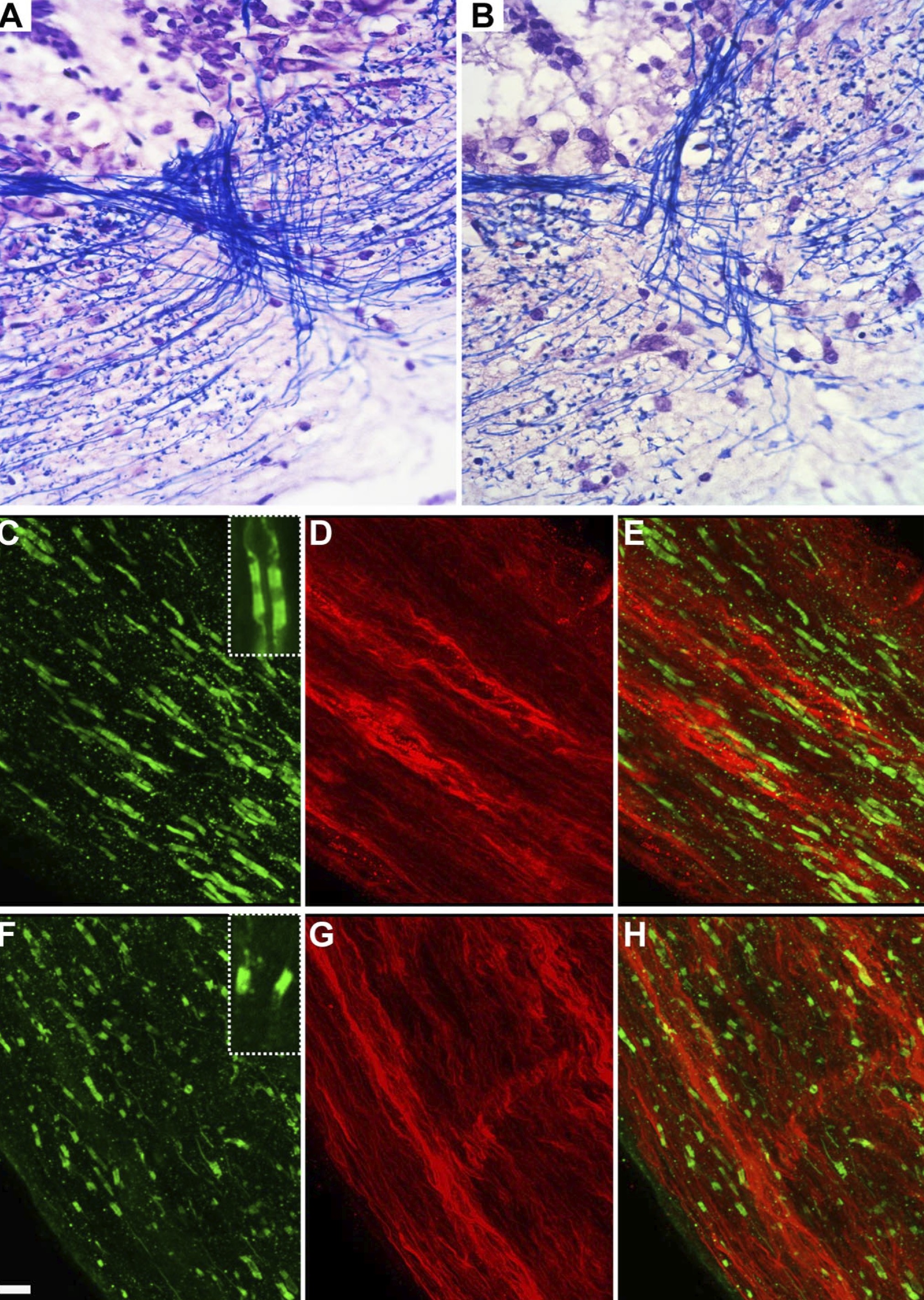 Figure 4. MTZ treatment induces demyelination without axonal damage. A, B, Myelinated fibers staining with Luxol fast blue on coronal sections across the medulla at stage 55 in untreated (A) or MTZ-treated (B) transgenic animals. C–H, Whole mount of optic nerve at stage 55 immunostained for neurofascin (green) and SMI-31 (red) in untreated (C–E) or MTZ-treated (F–H ) transgenic animals. Insets in C and F are high magnifications of nodes of Ranvier showing a strong signal for NF 155 in the paranodal domain and a weaker signal in the node (NF186) in a control animal (C), where in case of partial demyelination, only hemiparanodes are labeled (F ). MTZ treatment induced demyelination, characterized by disorganization of the neurofascin nodes of Ranvier (F, H ) with numerous heminodes compared with control (C, E). In MTZ-treated tadpoles, SMI-31 axons had a normal appearance (G, compared with D), suggesting that MTZ-induced demyelination does not affect the axons. Scale bar (in F ) A,B,17 um; C–H, 5um;insets (C,F), 2um.